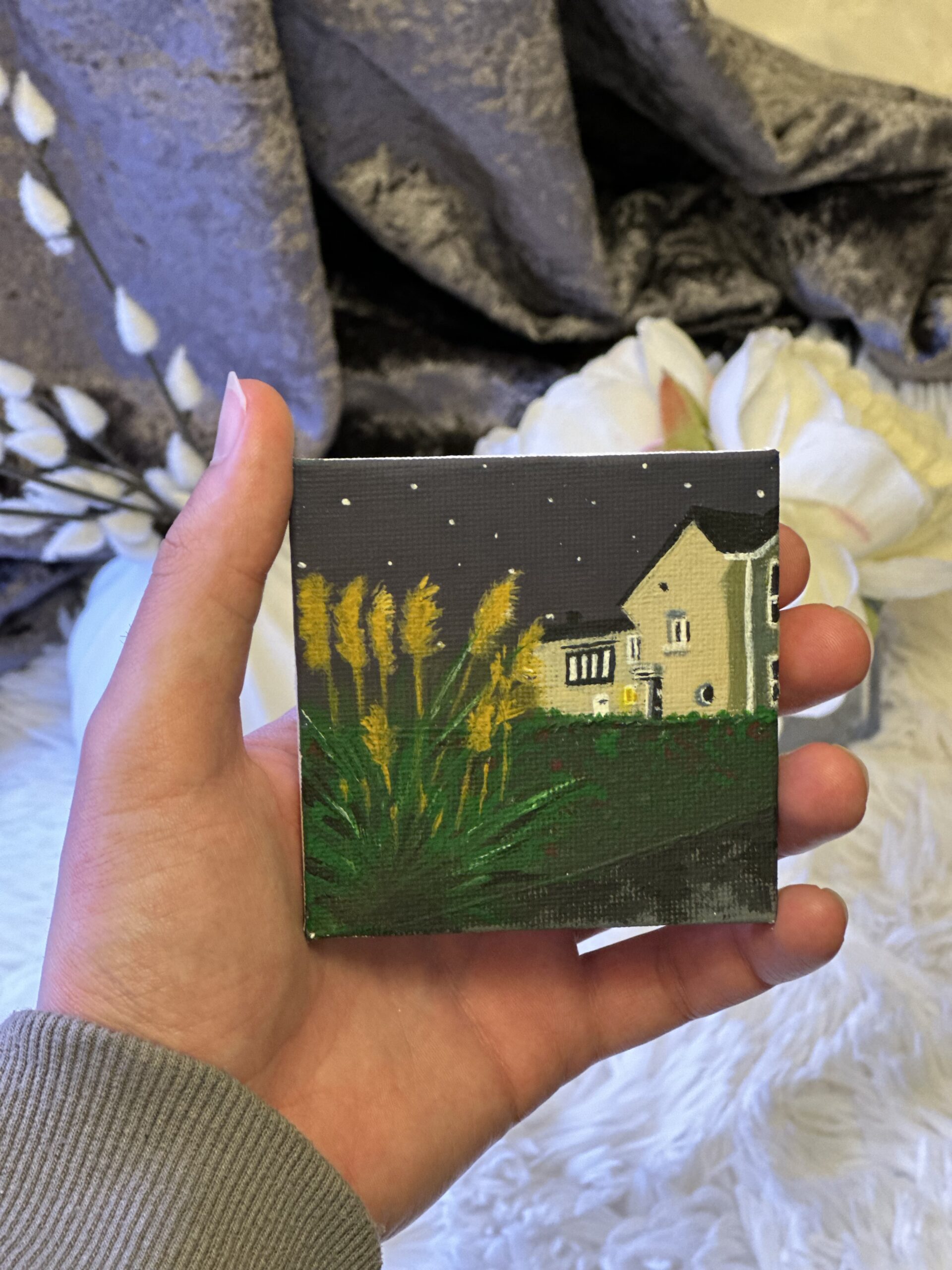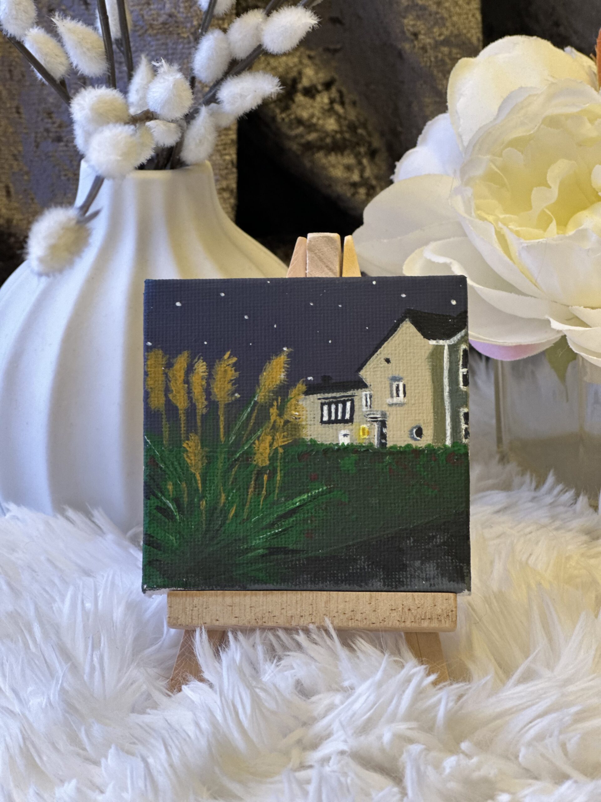 Авторска акрилна рисунка върху 10х10 см платно с миниатюрен статив.