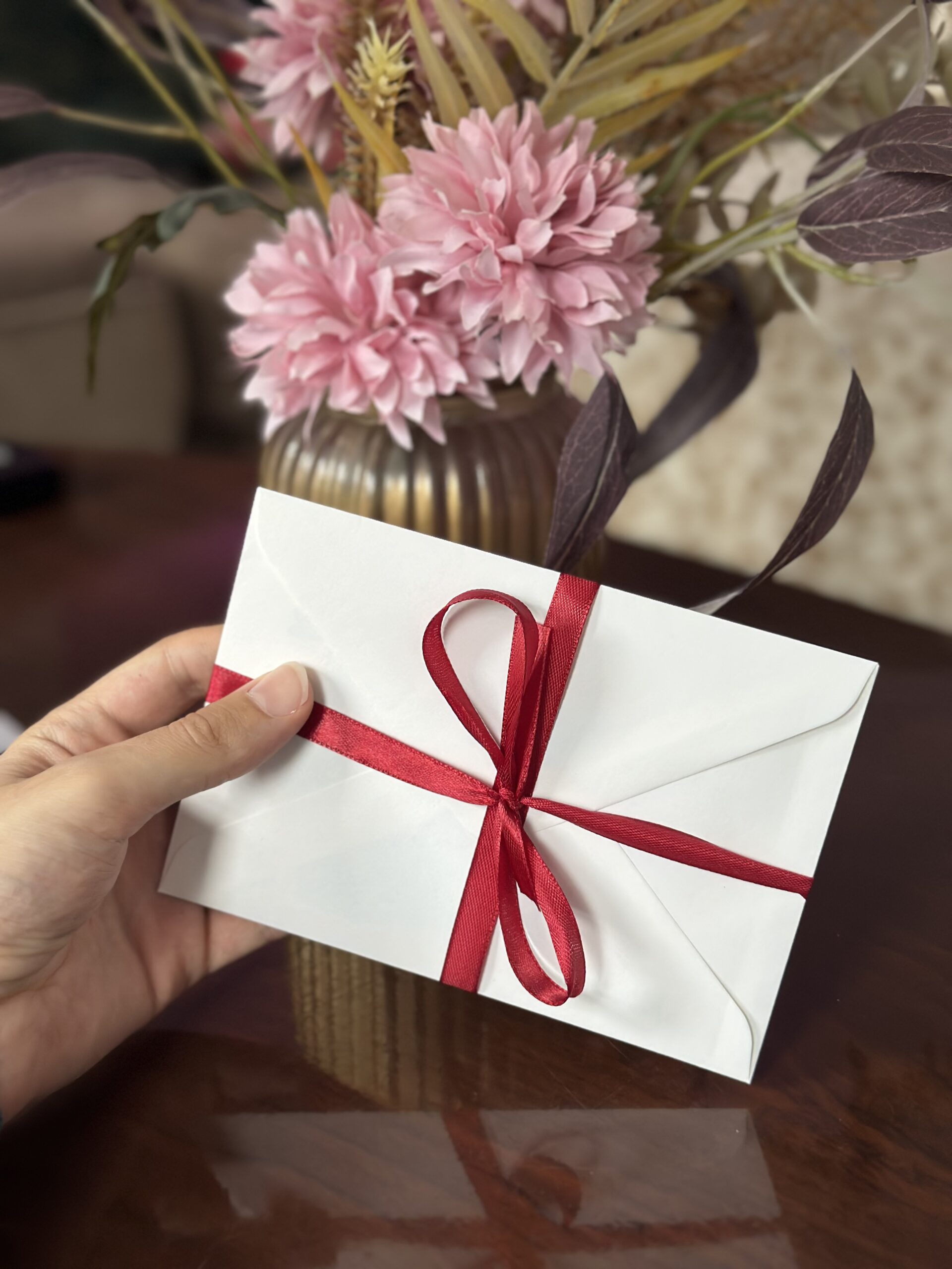 Картичка (8.8 x 5.2 см) с плик и червена сатенена панделка
