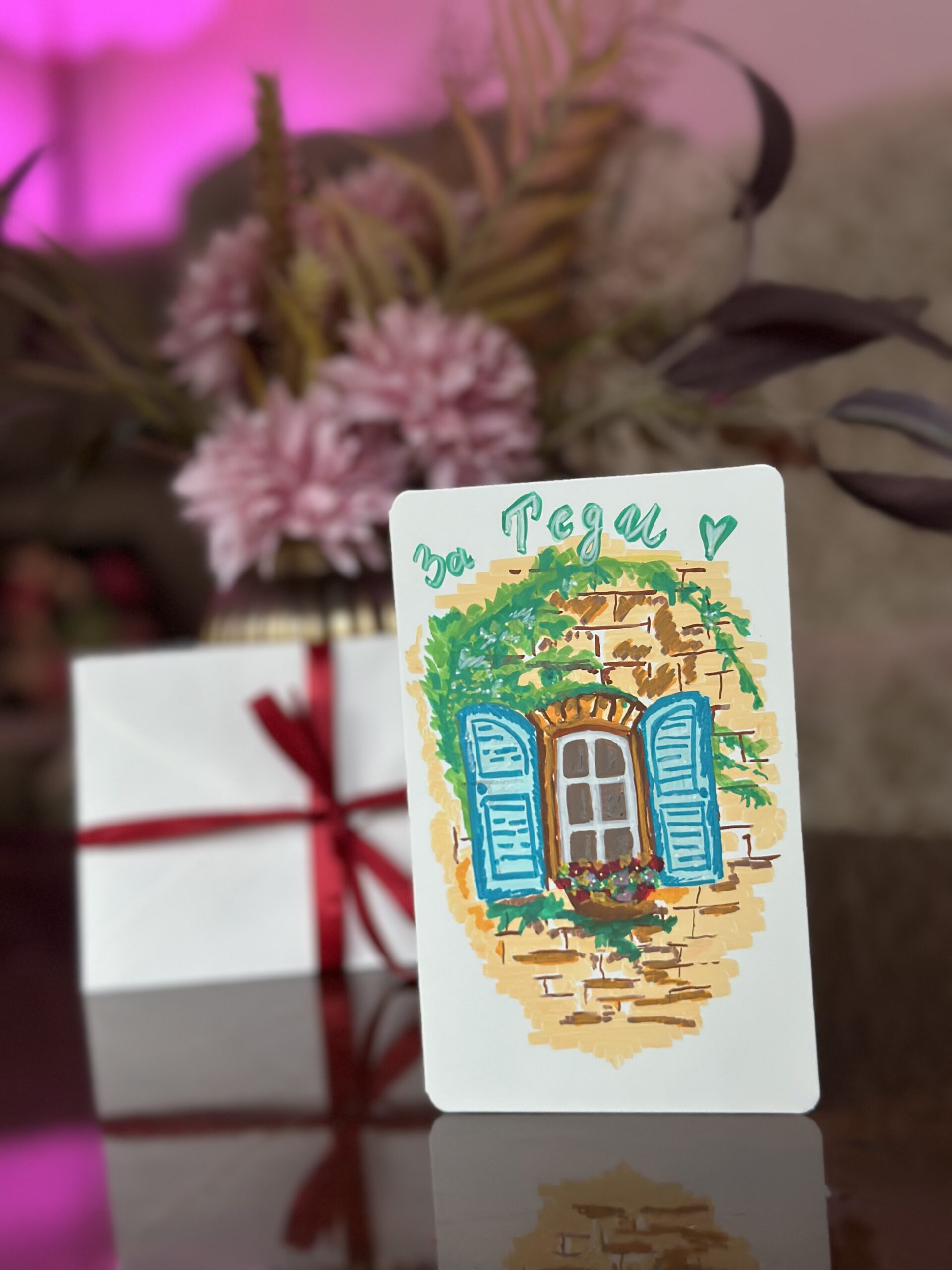 Нежна илюстрация на прозорец – символ на светлина, надежда и ново начало. Прозорецът носи усещане за дом, тишина и споделен момент. Името се изписва ръчно с акрилни маркери, което прави всяка картичка уникална и неповторима.